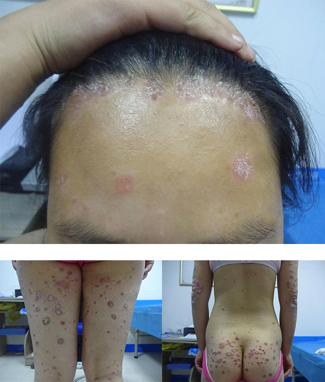 查体:全身散在点片状皮损伴鳞屑,以头部、四肢皮损较重,多处新出红色点状皮损。已告知病人及其家属病情处于急性发展期,近期有加重情况是属于正常,病人及家属表示理解并同意治疗!